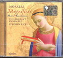 Morales fu il primo compositore spagnolo a raggiungere una fama a livello internazionale, un fatto che trova conferma nei giudizi dei suoi contemporanei, che lo descrissero come «la luce musicale della Spagna». Sebbene la discografia delle opere di Morales sia relativamente scarsa, alcuni lavori sono riusciti ad attirare l’attenzione di diversi ensemble specializzati nel repertorio rinascimentale, che li hanno eletti a loro cavalli di battaglia relegando però nell’oblio la maggior parte della sua produzione. Questo nuovo disco della Hyperion si pone l’obiettivo di iniziare a colmare questa grave lacuna, presentando una silloge di opere di straordinaria bellezza ma tutt’altro che ben conosciute. Il lavoro di maggior respiro proposto in questo disco è il Magnificat primi toni. Questo disco è il primo a presentare un Magnificat di Morales nella sua interezza, rispettando le intenzioni dell’autore. Grazie alla loro attività concertistica e discografica, il Brabant Ensemble e Stephen Rice si stanno rapidamente confermando tra gli interpreti più autorevoli nel repertorio polifonico rinascimentale.