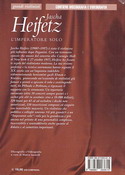 Jascha Heifetz (1900?-1987) è stato il violinista più influente dopo Paganini. Con un terremoto epocale che muove dal concerto alla Carnegie Hall di New York il 27 ottobre 1917, Heifetz ha fissato le regole del violinismo moderno. La sua visione profetica e la tecnica sovrumana hanno segnato il XX secolo con un’impronta indelebile ridimensionando beniamini quali Elman e Kreisler, provocando un’ecatombe di violinisti già famosi o pronti a spiccare il volo e costringendo tutti, da Príhoda a Perlman, a ripensare il rapporto con lo strumento. Un repertorio smisurato (oltre 30 concerti sempre pronti e i cachet più alti in assoluto: sino a 10.000 dollari), 320 brani per 65 cd ad escludere i dischi non autorizzati, 150 trascrizioni composte ed eseguite con inarrivabile maestria. Un violinista che pubblico e colleghi sentono e un “Imperatore solo”: solo per la grandezza e più ancora nel privato di una personalità complessa, inaccessibile e contradditoria anche quanto al didatta e al camerista importanti.